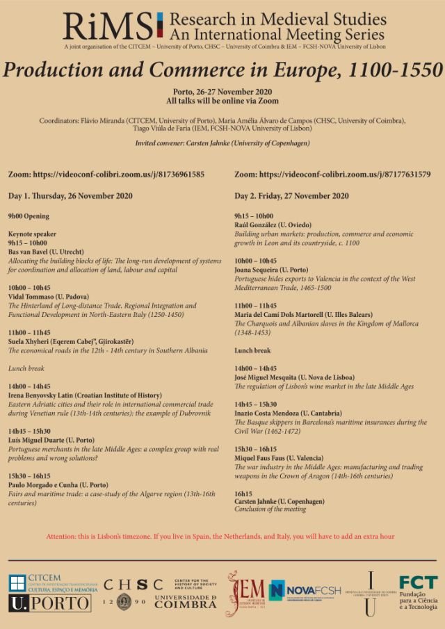 The first meeting (26 and 27 November) will discuss the linkage between production and trade across several European regions over an extended timeline. Factors such as technical and technological innovation, and advances in the productive sector will come under analysis as they connected with the development of merchant and commercial networks, and of economic markets. Production and Commerce in Europe, 1100-1550 features Carsten Jahnke (U. Copenhagen) as guest convener and Bas van Bavel (U. Utrecht) as keynote speaker.